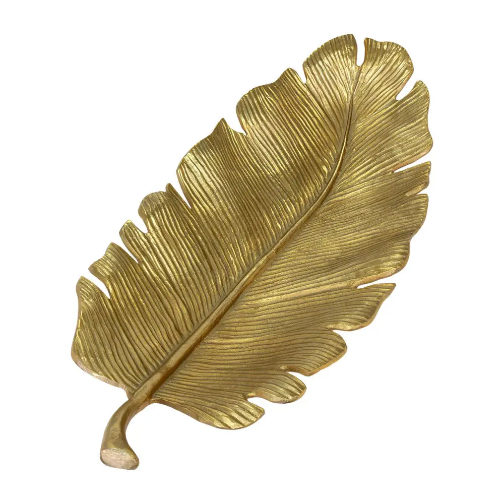 Bring the elegance of the tropics into your home with the Bali Tray, a sculptural decorative accent that captures the organic beauty of nature in a high-end finish. Expertly crafted from aluminum, this oversized tray is designed to mimic a sweeping leaf form, complete with intricate veining and graceful curvature. The shimmering gold surface enhances its dramatic shape, offering a radiant touch of texture and sophistication to any room. Measuring 34 inches long, 14 inches wide, and 7 inches high, the Bali Tray makes a striking impression whether placed on a coffee table, console, or dining table. Its dimensional silhouette and generous scale make it ideal for use as a statement centerpiece or standalone sculptural decor. Both artful and functional, this piece effortlessly complements eclectic, modern, and global-inspired interiors. For those looking to blend organic forms with metallic luxury, the Bali Tray delivers a bold and unforgettable finish.