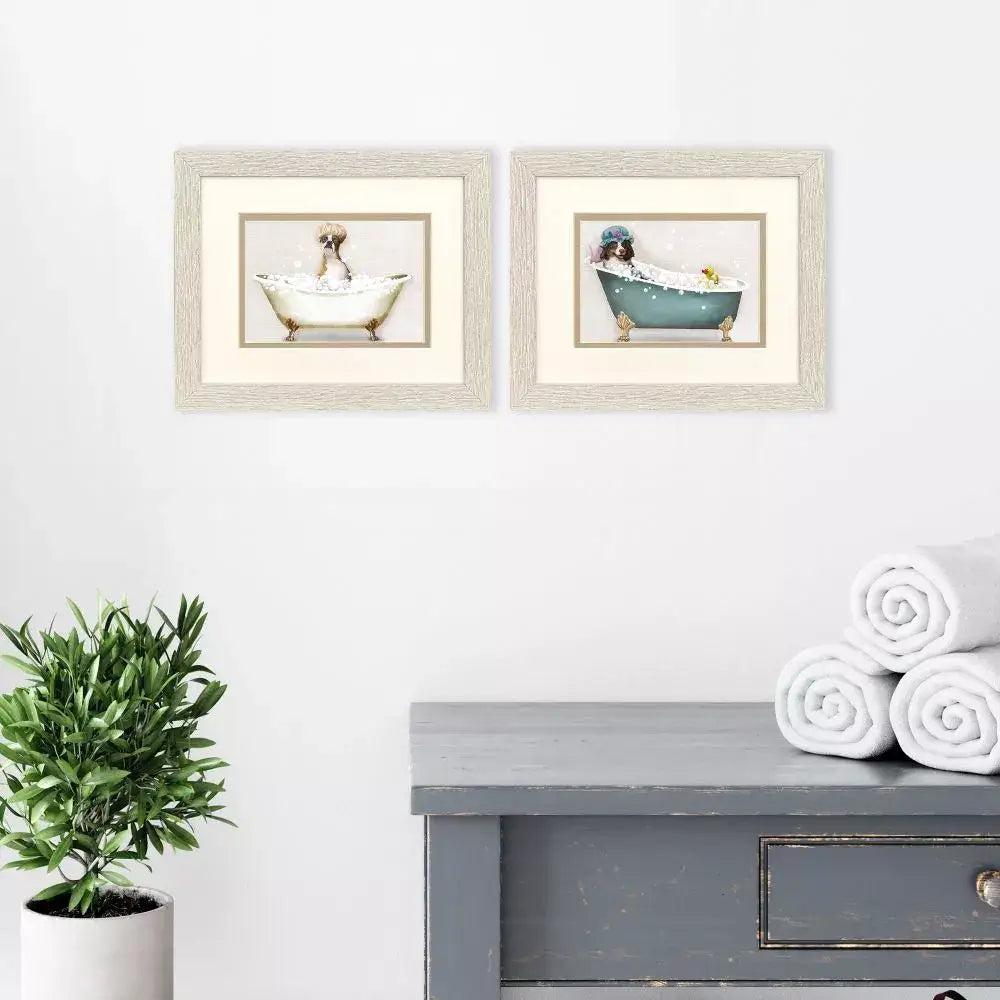 A whimsical delight, playful doggies enjoy bubble baths in vintage tubs. Matted in white and framed in a distressed whitewash finish moulding.