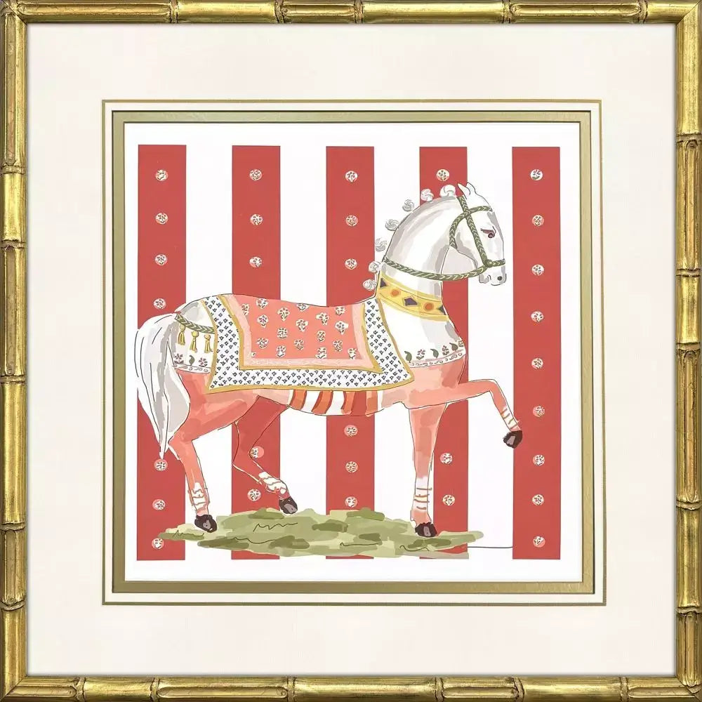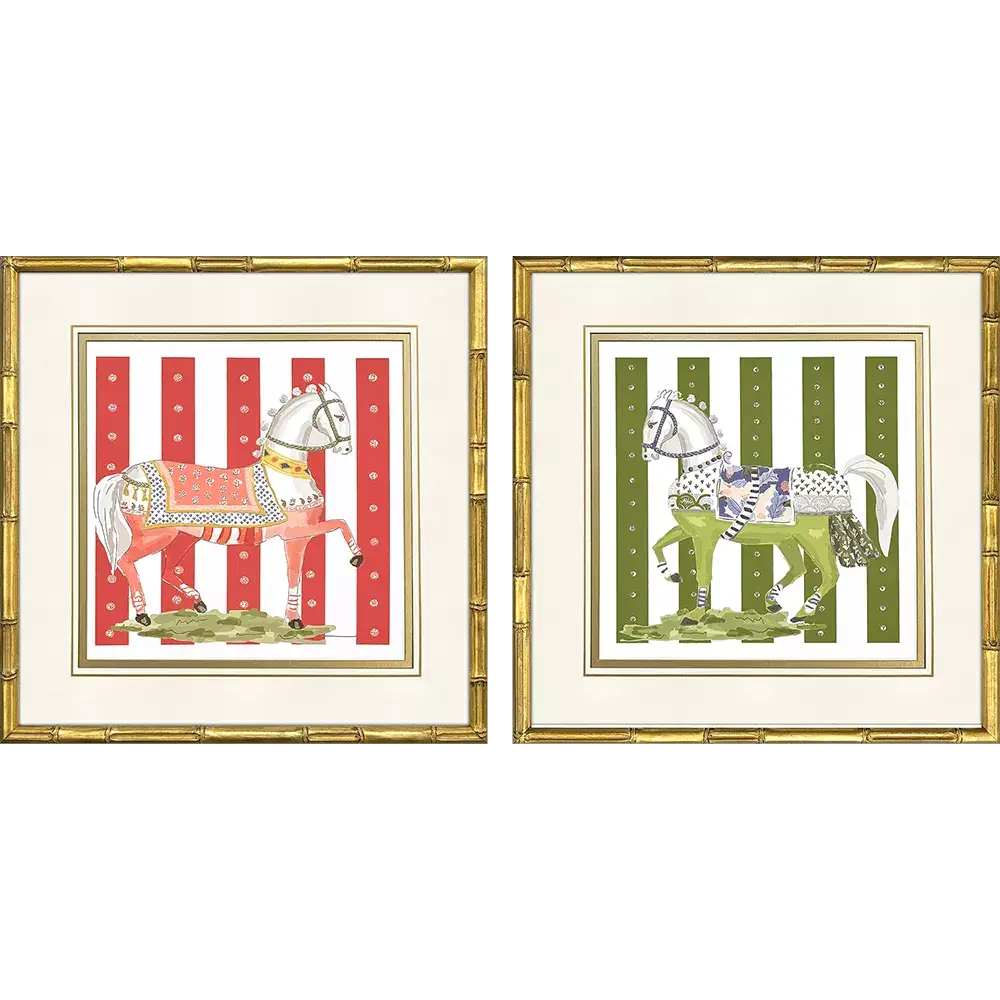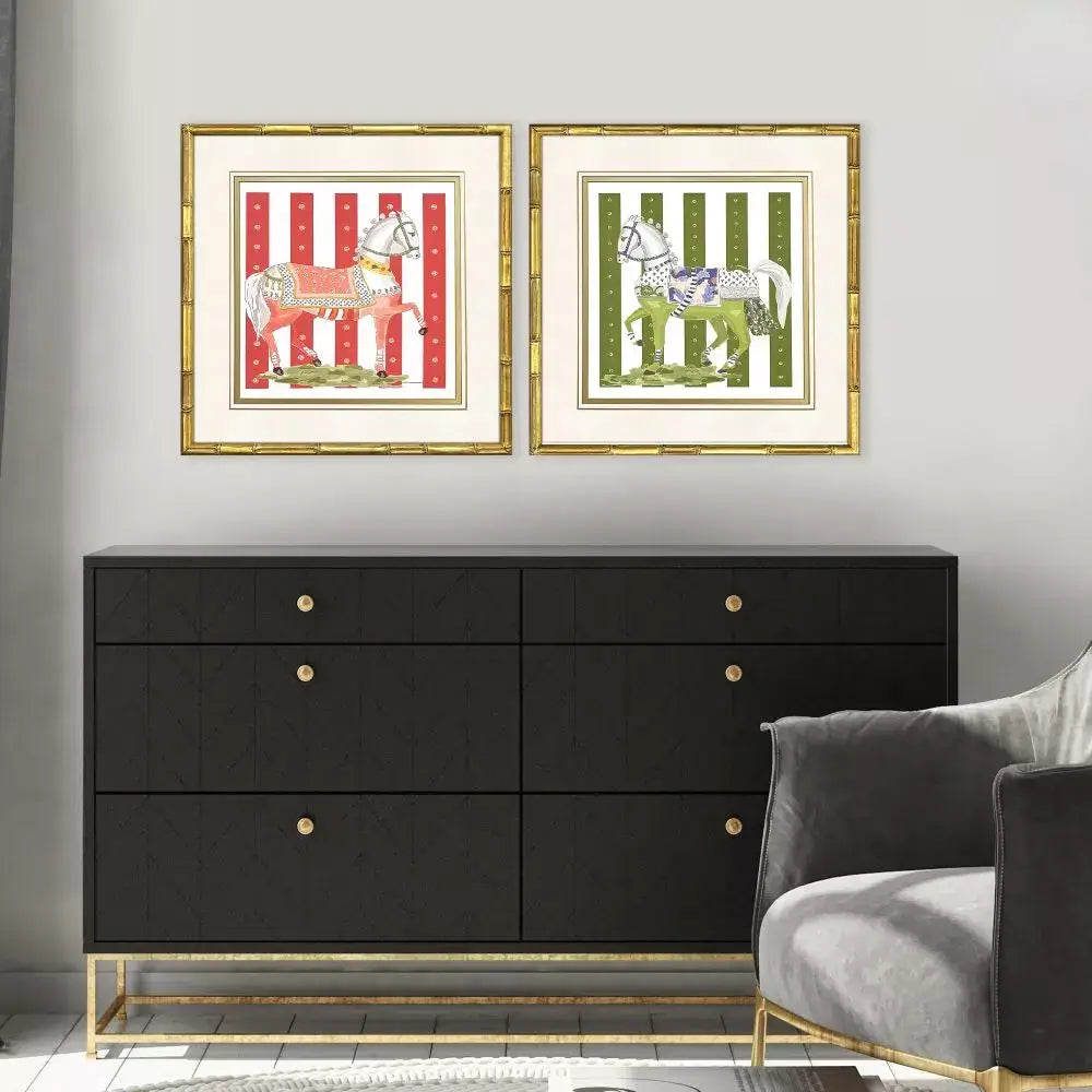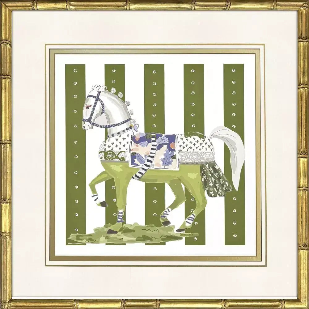 Decorative horses feature premium matting accented with hand drawn gold lines and bevels. Framed in an antique gold wood with bamboo embossing.