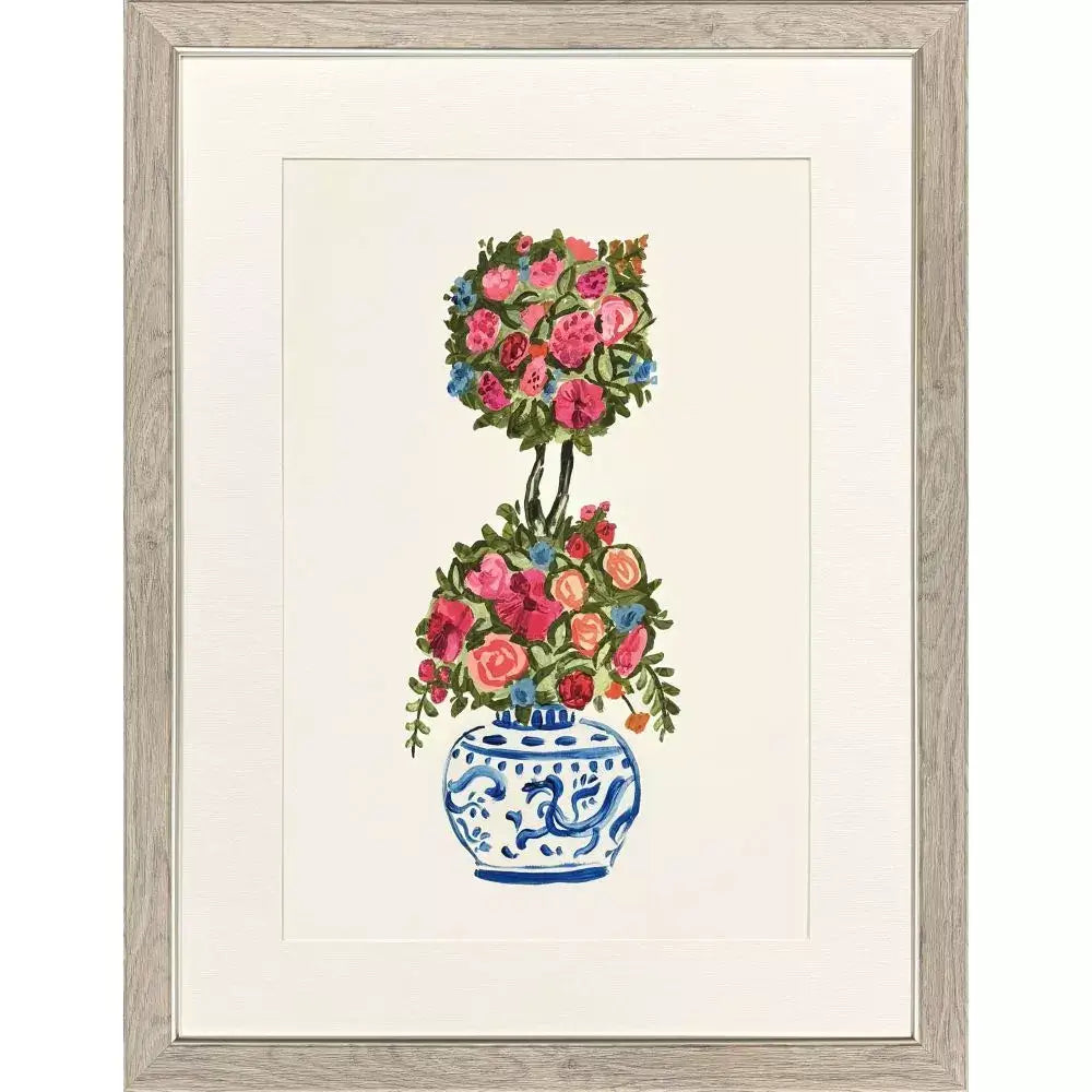 Lush floral topiaries in classic blue and white porcelain feature premium matting. Framed in a natural wood finish moulding with champagne gold lip.