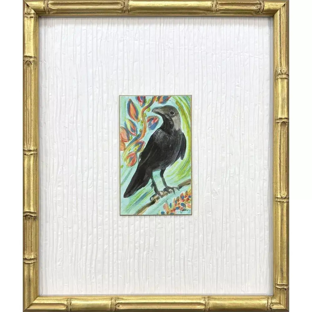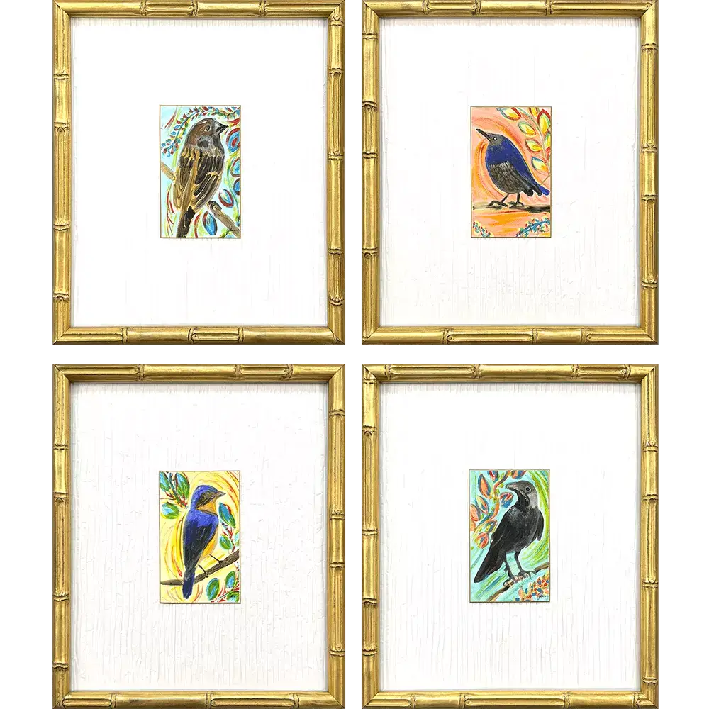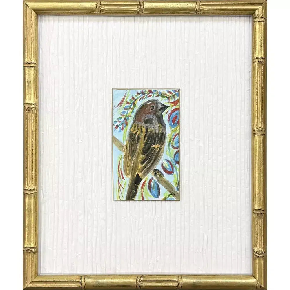 Birds are raised mounted on a decorative paper and accented with a hand applied gold bevel. Framed in an antique gold wood with bamboo embossing.