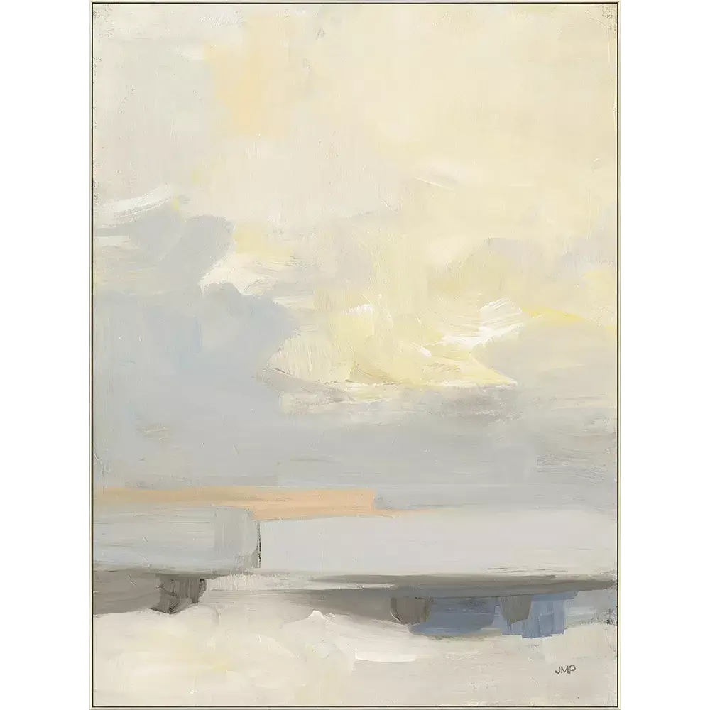 A contemporary cloudy landscape features a hand applied enhanced gel finish. Dimensionally framed in a champagne gold finish molding.