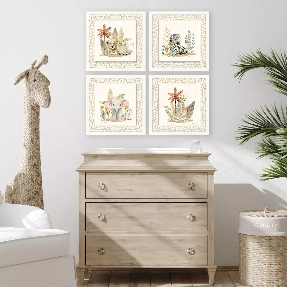 Adorable baby animals are absolutely perfect to welcome a little one! Framed to the image in a modern flat profile moulding in a matte white finish.